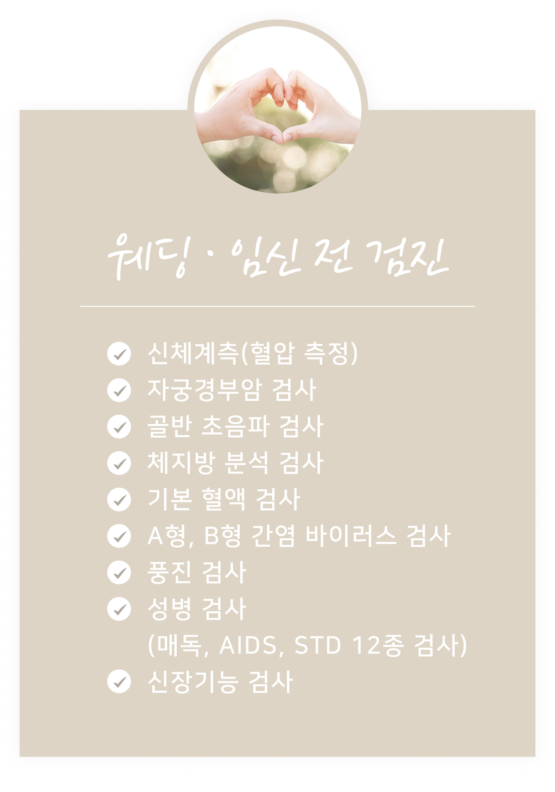 기본적인 건강 상담 및 진찰, 부인과 진찰과 초음파 검사 등을 포함하여 건강 문제 발생 위험을 줄이고, 임신을 안전하게 준비할 수 있게 도와줍니다