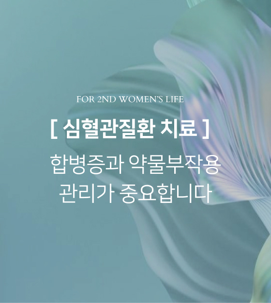 여성의 호르몬 변화를 고려한 정밀 검진을 통해, 심혈관계 합병증 위험을 미리 파악하고, 에스트로겐 감소에 따른 골다공증, 고혈압 등 합병증 문제들을 종합적으로 관리해드립니다